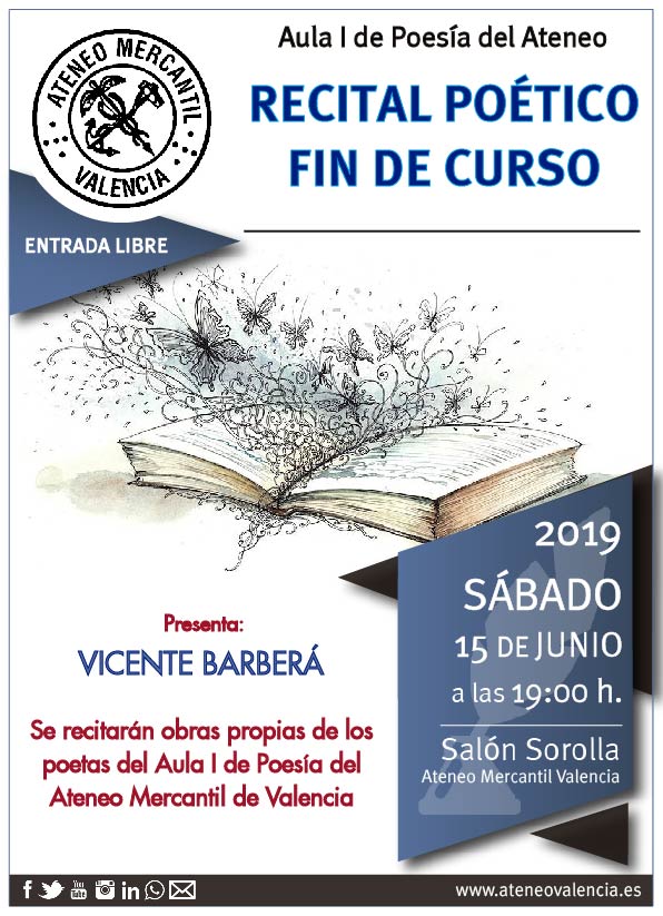 El próximo sábado 15 de junio a las 19 horas en el Salón Sorolla el Aula I de Poesía del Ateneo Mercantil de Valencia pondrá fin al curso 2018-19 con un gran recital poético en el que participarán todos los poetas de este magnífico grupo que se ha formado en nuestra institución. Si eres amante la poesía, no te lo puedes perder, ya que estarán muchos de los mejores poetas valencianos del momento. La poesía está de moda y más en Valencia y en un lugar como el Ateneo Mercantil que se ha erigido como el punto de encuentro de lo más granado de la poesía de la Comunitat. Los poemas que se leerán son obras propias de los poetas del Aula I.