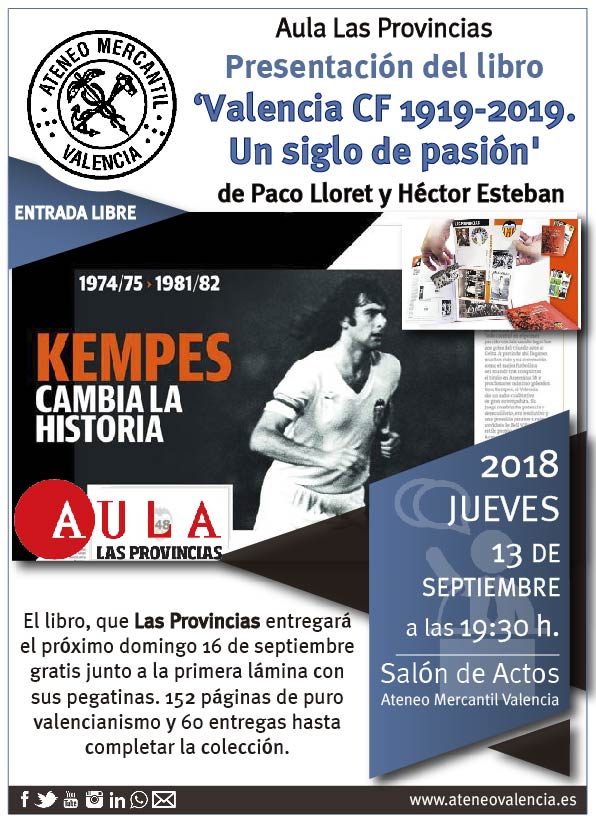 Este jueves 13 de septiembre a las 19.30 horas tendrá lugar la presentación del libro 'Valencia CF 1919-2019. Un siglo de pasión' en el Salón de Actos del Ateneo Mercantil de Valencia dentro del Aula LAS PROVINCIAS. Cabe recordar que este acto de valencianismo es totalmente gratuito hasta completar el aforo existente. De este modo se producirá la puesta de largo de un valioso ejemplar que contará con la participación de varios exfutbolistas del club valencianista, además del periodista Paco Lloret y el jefe de la sección de Deportes de Las Provincias, Héctor Esteban, ambos, autores del volumen.