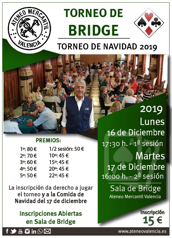 Como cada año, el Torneo de Bridge de Navidad regresa al Ateneo Mercantil con la fuerza y con un gran número de participantes. Son ya varios los años en los que se ha disputado este torneo y siempre ha tenido una gran acogida entre los socios. Inscripciones Abiertas en la Sala de Bridge.