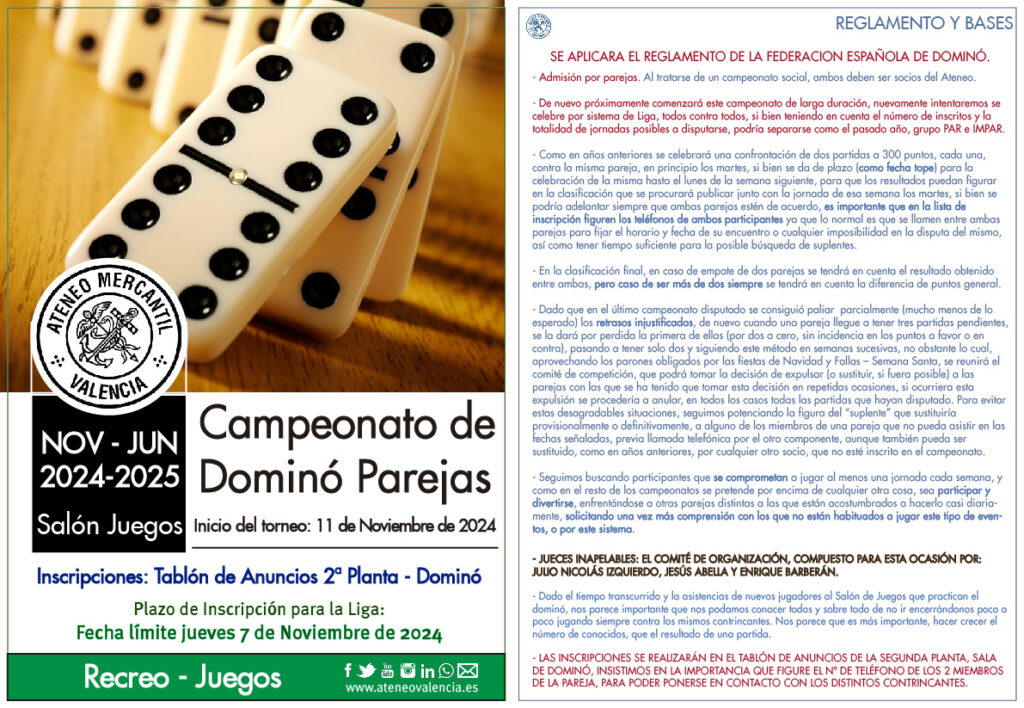 Ya está abierto el plazo de inscripción hasta el jueves 7 de noviembre para todos los socios interesados en disputar el Campeonato de Dominó por Parejas. Recordar que la información la podéis encontrar en el mismo cartel que se adjunta en este enlace y las inscripciones están en el Tablón de Anuncios de la segunda planta, en la Sala de Juegos, en la zona del Dominó. Además, podéis preguntar cualquier duda al responsable de la sección, que es Jesús Abella. El torneo se juega desde noviembre de 2024 hasta junio de 2025.
