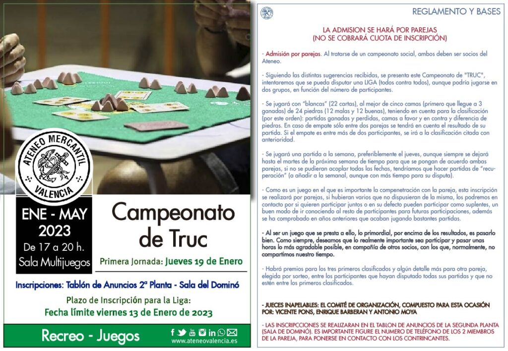 Llega de nuevo el Campeonato de Truc del Ateneo Mercantil de Valencia 2023 y lo hace bajo el sistema de Liga de todos contra todos. La primera jornada se disputará el jueves 19 de enero a las 17 horas, mientras que la fecha límite de la inscripción será hasta el viernes 13 de enero de 2023, unos días antes del inicio del campeonato.