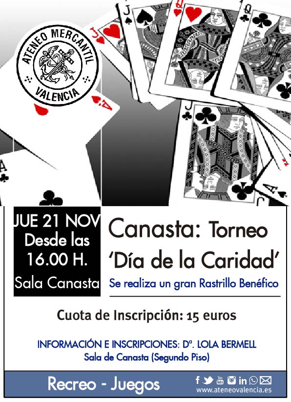 Antes de llegar las Navidades el juego de la Canasta quiere solidarizarse con los más desfavorecidos y ha organizado un nuevo torneo benéfico 'Día de la Caridad'. Se espera que un año más el torneo sea un éxito de participación, como en años anteriores, ya que con la ayuda de todas las jugadoras de Canasta se puede hacer felices a los que no tienen nada. Una vez más los socios y socias del Ateneo quieren mostrar su lado más humanitario y además, se celebrará un gran rastrillo que también será benéfico para la misma causa.