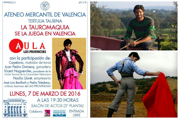Este lunes 7 de marzo, el torero Cayetano Rivera estará en el Ateneo Mercantil para hablar de toros y el momento en el que se encuentra la Fiesta. Interesante tertulia enmarcada en el Aula Las Provincias y que se completa con un gran elenco de entendidos: Juan Pedro Domecq, ganadero, Vicent Nogueroles, presidente de la Unió Taurina de la Comunidad Valenciana, el diputado de la Plaça de Bous, Toni Gaspar, Nacho Lloret, empresario, y los críticos taurinos: José Luis Benlloch y Pedro Toledano.