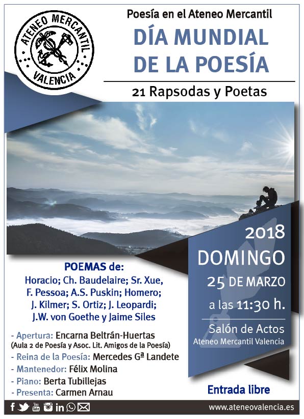 Si quieres disfrutar del Día Mundial de la Poesía 2018, en el Ateneo Mercantil hemos programado un gran Recital de Poemas con Piano para este domingo 25 de marzo, a las 11.30 horas en el Salón de Actos.