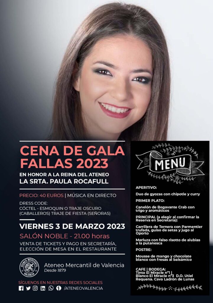 Previamente a la cena, en primer lugar, se recibirá a las reinas de años pasados y, tras éstas, le llegará el turno a la Corte de Honor y nuestra reina Paula Rocafull. La Cena de Gala es uno de los eventos más importantes de las Fallas para nuestra casa. Tras la cena habrá música en directo y baile hasta bien entrada la madrugada.