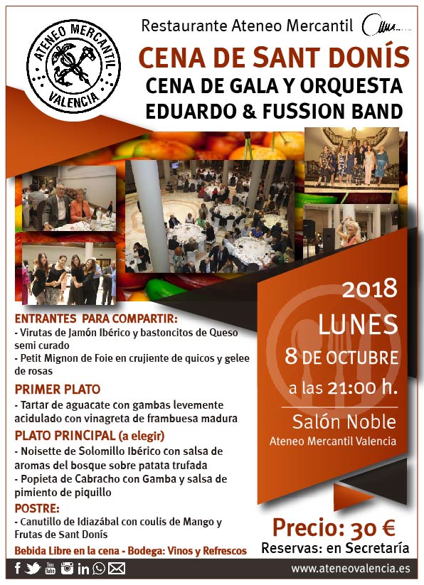 Llega la tradicional Cena de Sant Donís a nuestro Salón Noble este lunes 8 de octubre para celebrar el día de los enamorados valencianos. Una celebración dentro de los actos de celebración del 9 d’Octubre, día de la Comunitat Valenciana. El Restaurante del Ateneo, del Grupo Alma, que ha preparado un menú de 30 euros, que consta de entrantes, un primer plato y un plato principal, postre y bebida durante toda la cena. Además, habrá obsequio de un regalo sorpresa. Una vez termine la cena comenzará el baile con la Orquesta 'Eduardo & Fussion Band’. Reservas en Secretaría: