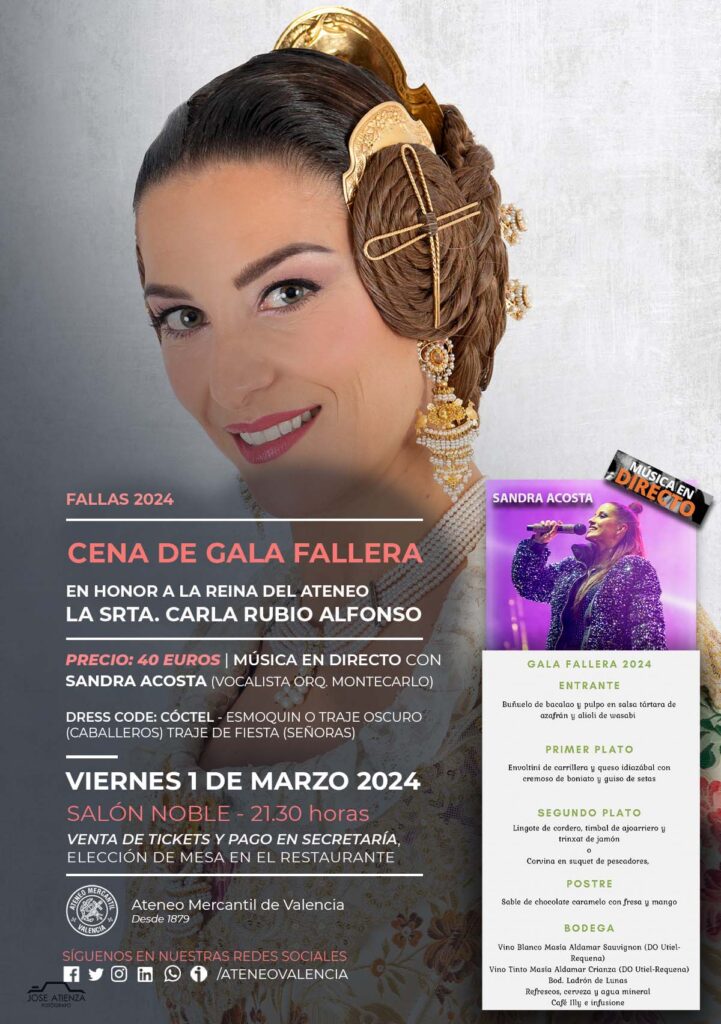 El Ateneo Mercantil organiza la Cena de Gala Fallera 2024 en honor a nuestra Reina del Ateneo, la Srta. Carla Rubio Alfonso, para presentarla en sociedad y poner en valor su figura. La cena será el próximo viernes 1 de marzo y arrancará a las 21:30 horas en el Salón Noble. Además, al término de la cena, la velada seguirá con música en directo gracias a Sandra Acosta, la vocalista de la orquesta Montecarlo.