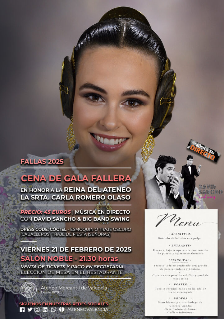 El Ateneo Mercantil de Valencia se complace en invitarles a la Cena de Gala Fallera 2025, una velada muy especial en honor a la Reina del Ateneo, Carla Romero Olaso, y su Corte de Honor, integrada por Victoria Coronado García, Sofía Santamaría Ortega, Clara Pérez-Salamero Pla y Nerea Calatayud Alguacil.