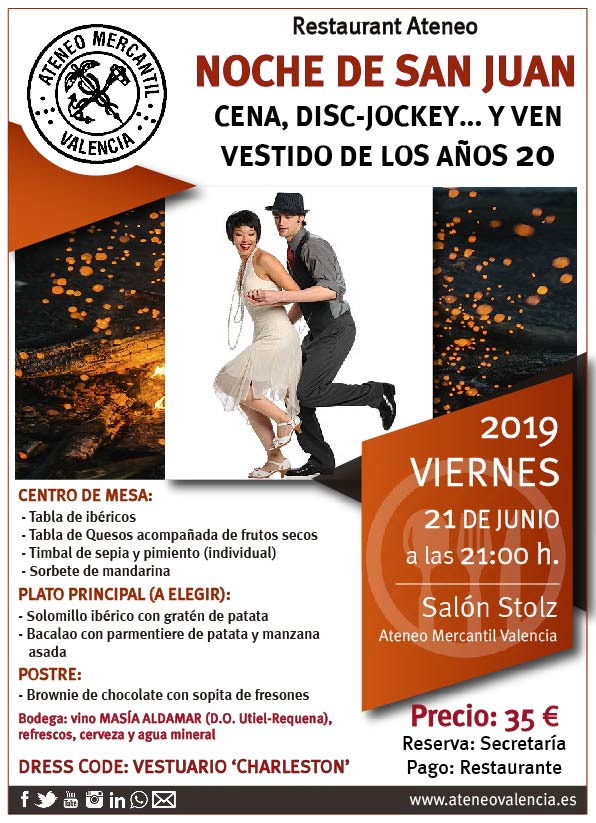 Los socios del Ateneo Mercantil de Valencia disfrutarán de una gran fiesta social para dar la bienvenida al verano en el Salón Stolz con la Cena de Gala de la Noche de San Juan. Se espera que más de centenar de socios de nuestra institución pasen una gran velada rodeados de amigos y de familiares. Un evento especial en la que se espera una cena, música con un disc-jockey y se ha citado a todo el mundo para que venga vestido de los Años 20, de Charleston, para disfrutar de la fiesta y todo en un marco incomparable.