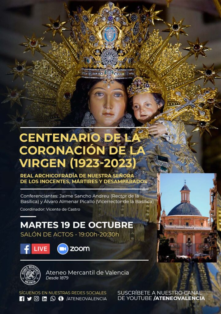 El Ciclo de Entidades Históricas Valencianas llega el próximo martes 19 de octubre a las 19 horas al Salón de Actos del Ateneo Mercantil con la conferencia sobre la Real Archicofradía de Nuestra Señora de los Inocentes, Mártires y Desamparados que tratará el tema del "Centenario de la Coronación de la Virgen (1923-2023)" y los ponentes serán el Rector de la Basílica, D. Jaime Sancho Andreu y el Vicerrector de la Basílica, D. Álvaro Almenar Picallo.