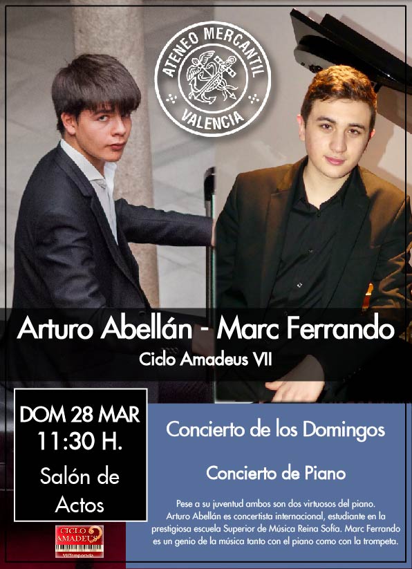 El próximo domingo 28 de marzo a las 11.30 horas llega un nuevo concierto gratuito en el Salón de Actos del Ateneo Mercantil con el Ciclo Amadeus VII de Piano que trae a dos jóvenes promesas que pese a su juventud son dos virtuosos del piano. Arturo Abellán es concertista internacional, estudiante en la prestigiosa escuela Superior de Música Reina Sofía, mientras que Marc Ferrando es un genio de la música tanto con el piano como con la trompeta.