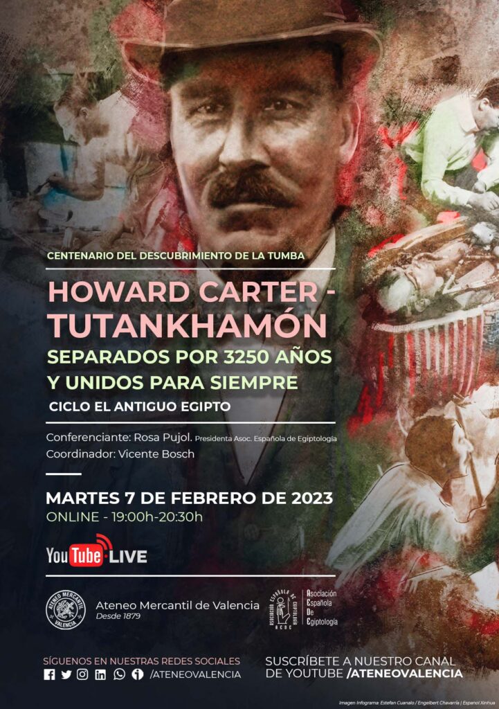 Con la llegada del nuevo año llega la primera de las conferencias programadas para el Ciclo Antiguo Egipto para este 2023 con una ponencia muy especial sobre Howard Carter y Tutankhamón, ya que hace unos meses que se ha celbrado el centenario del descubrimiento de la tumba del gran faraón. "Howard Carter - Tutankhamón: Separados por 3250 años y unidos para siempre" nos traerá todo lo que ocurrió cuando el británico Howard Carter descubrió en el Valle de los Reyes de Egipto los primeros escalones que llevaban a la tumba de Tutankamón, un sepulcro intacto, de tesoros inimaginables. La ponente será la presidenta del Asociación Española de Egiptología, Rosa Pujol.