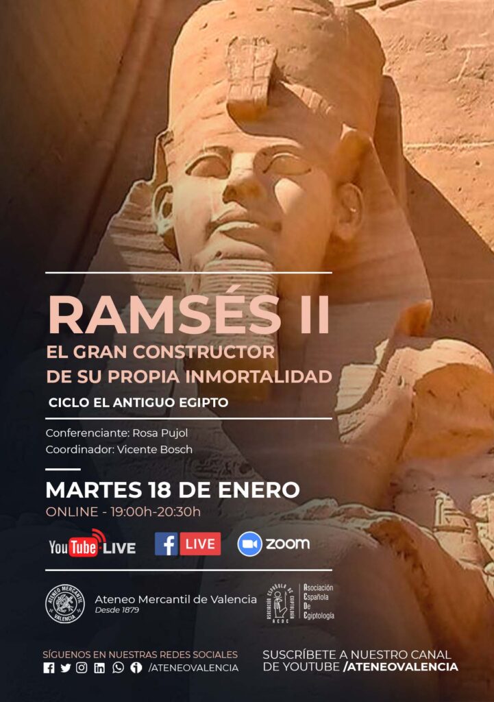 El Ciclo Antiguo Egipto nos trae una conferencia muy esperada, "Ramses II. El gran constructor de su propia inmortalidad", y que ofrecerá de manera telemática la presidenta de la Asociación Española de Egiptología, Rosa Pujol, el próximo martes 18 de enero a las 19 horas. Pueden seguirla por el Canal de Youtube del Ateneo, por FacebookLive y por Zoom.