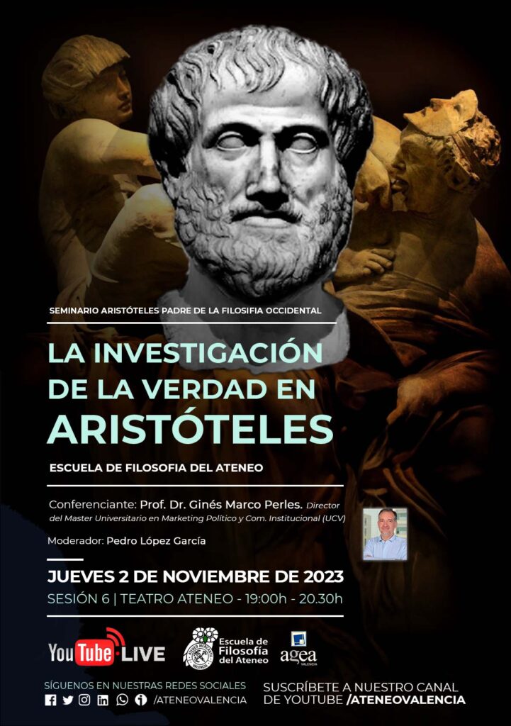 La Escuela de Filosofía del Ateneo trae la sexta y última sesión del 'Seminario Aristóteles, padre de la Filosofía Occidental' que organiza la Fundación del Ateneo Mercantil de la CV en colaboración con la Asociación Grupo de Estudios de Actualidad de Valencia, Agea Valencia. La sesión llega bajo el título "La investigación de la verdad en Aristóteles" y el ponente es el Director del Master Universitario en Marketing Político y Comunicación Institucional de la UCV, el Prof. Dr. Ginés Marco Perles.