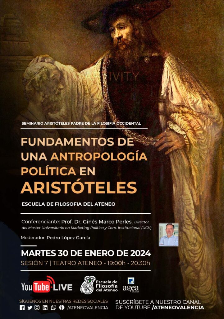 La Escuela de Filosofía del Ateneo trae la séptima sesión del 'Seminario Aristóteles, padre de la Filosofía Occidental' que organiza la Fundación del Ateneo Mercantil de la CV en colaboración con la Asociación Grupo de Estudios de Actualidad de Valencia, Agea Valencia. La sesión llega bajo el título "Fundamentos de una antropología política en Aristóteles" y el ponente es el Director del Master Universitario en Marketing Político y Comunicación Institucional de la UCV, el Prof. Dr. Ginés Marco Perles.
