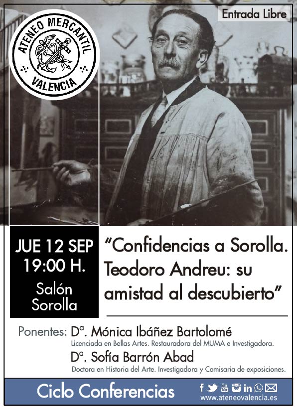 En la conferencia se descubrirá a través de una colección epistolar, que el pintor Teodoro Andreu envió a su querido Maestro Joaquín Sorolla, custodiada actualmente en el Museo Sorolla de Madrid, el lado más humano, más íntimo y personal de dos artistas que compartieron una misma obsesión por la captación de la luz en su pintura, un amor desmesurado a su tierra natal y una necesidad sobrecogedora de mantener intacto su núcleo familiar, a pesar de los avatares y frecuentes viajes que su profesión les demandaba.