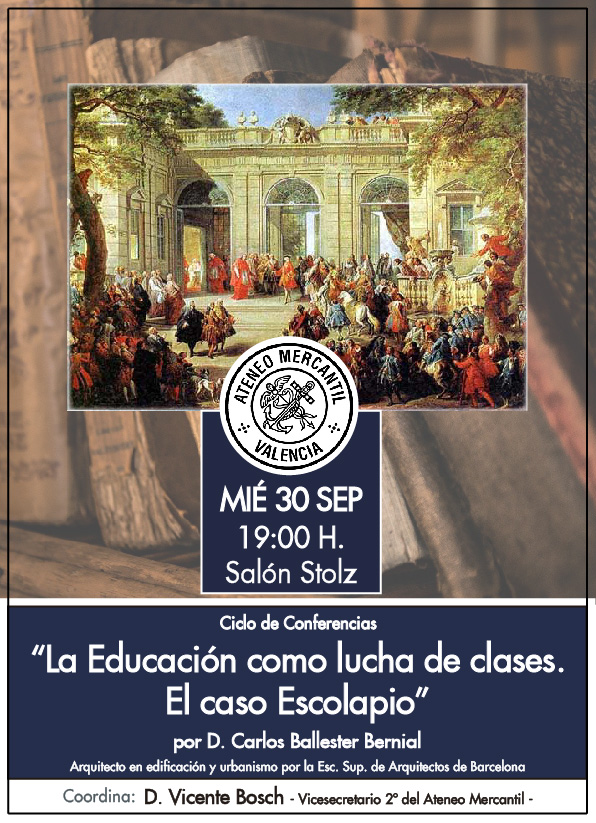El Ciclo Conferencias llegará el próximo miércoles 30 de septiembre a las 19.00 horas en el Salón Sorolla del Ateneo Mercantil con una conferencia en la que se hablará sobre como la educación fue el pistoletazo de salida para un movimiento social como la Ilustración. Bajo el título: "La Educación como lucha de clases. El caso Escolapio", el arquitecto en edificación y urbanismo por la Escuela Superios de Arquitectos de Barcelona, D. Carlos Ballester Bernial, nos explicará todos los cambios surgidos. Una consideración histórica de este proceso ilustrativo que llevó a las sociedades humanas al desarrollo industrial, científico, político, étc. de los siglos siguientes.