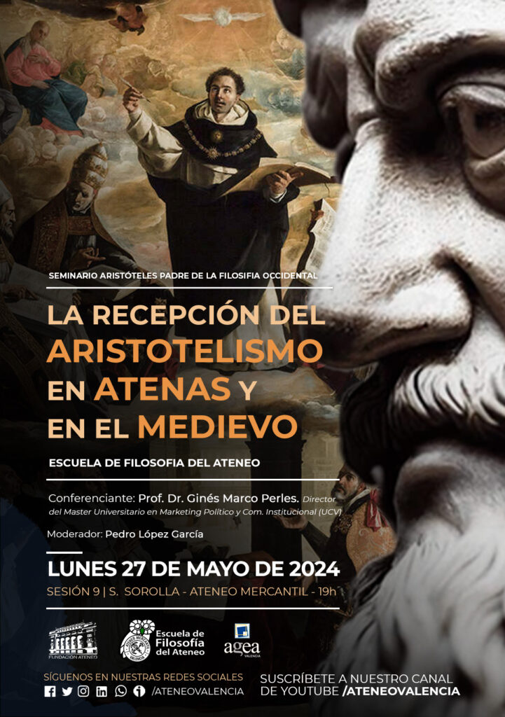 La Escuela de Filosofía del Ateneo trae la novena sesión del 'Seminario Aristóteles, padre de la Filosofía Occidental' que organiza la Fundación del Ateneo Mercantil de la CV en colaboración con la Asociación Grupo de Estudios de Actualidad de Valencia, Agea Valencia. La sesión llega bajo el título "La recepción de Aristóteles en Atenas y en el Medievo" y el ponente es el Director del Master Universitario en Marketing Político y Comunicación Institucional de la UCV, el Prof. Dr. Ginés Marco Perles.