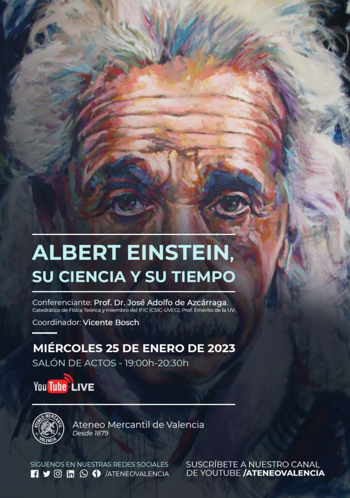 El Ateneo Mercantil de Valencia ha organizado un conferencia especial en la que se tratará de dar luz a una de las figuras más relevantes del siglo XX, uno de los científicos más importantes, conocidos y populares, Albert Einstein. Así el próximo miércoles 25 de enero de 2023 a las 19 horas en el Salón de Actos, el Catedrático de Física Teórica y miembro del IFIC (CSIC-UVEG) y Profesor Emérito de la UV, Prof. Dr. José Adolfo de Azcárraga, nos trae "Albert Einstein, su ciencia y su tiempo".