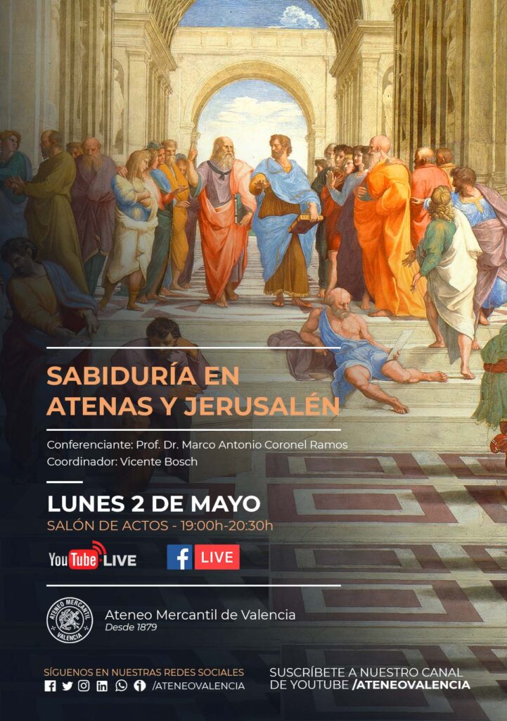 El Ciclo de Conferencias trae el próximo lunes 2 de mayo a las 19 horas hasta el Salón de Actos del Ateneo Mercantil de Valencia una ponencia titulada "Sabiduría en Atenas y Jerusalén". La impartirá el Prof. Dr. Marco Antonio Coronel Ramos, que es profesor en el Departamento de Filología clásica de la Universitat de València, es poeta y ensayista y autor de varios libros.