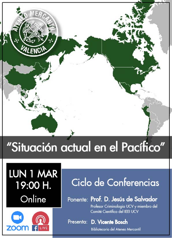 El Ciclo de Conferencias llega con una nueva reunión online el próximo lunes 1 de marzo a las 19 horas para hablarnos sobre la "Situación actual en el Pacífico" y el ponente será el profesor de Criminologia de la UCV y miembro del Comité Científico del IEEI UCV, el Prof. D. Jesús de Salvador.