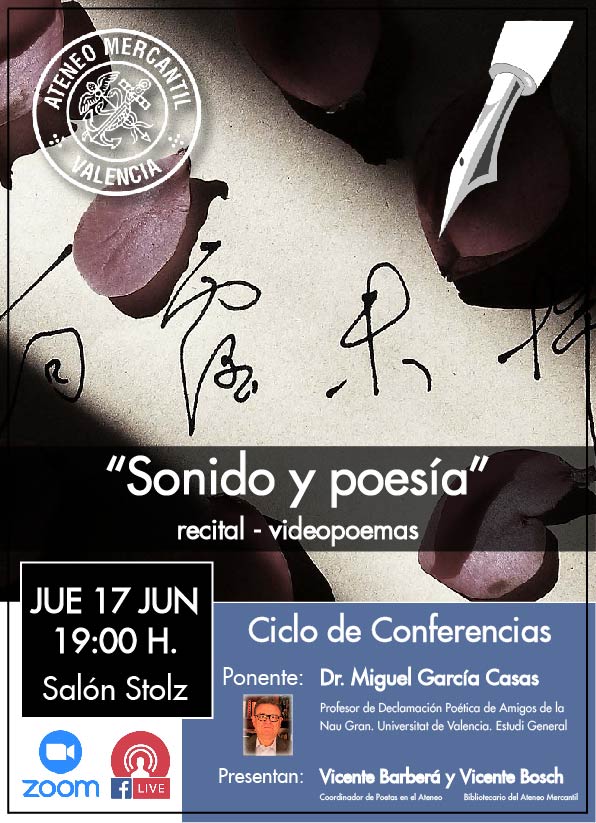 El Ciclo de Conferencias tiene una nueva cita el próximo jueves 17 de junio a las 19 horas en el Salón Stolz del Ateneo Mercantil con los seguidores de la poesía de nuestra institución. La conferencia llega bajo el título "Sonido y poesía" y el ponente será el Prof. Dr. Miguel García Casas, que es profesor de Declamación Poética de Amigos de la Nau Gran de la Universitat de València. Estudi General. Presentan el acto, D. Vicente Barberá, coordinador de Poetas en el Ateneo y D. Vicente Bosch, bibliotecario del Ateneo Mercantil de Valencia.