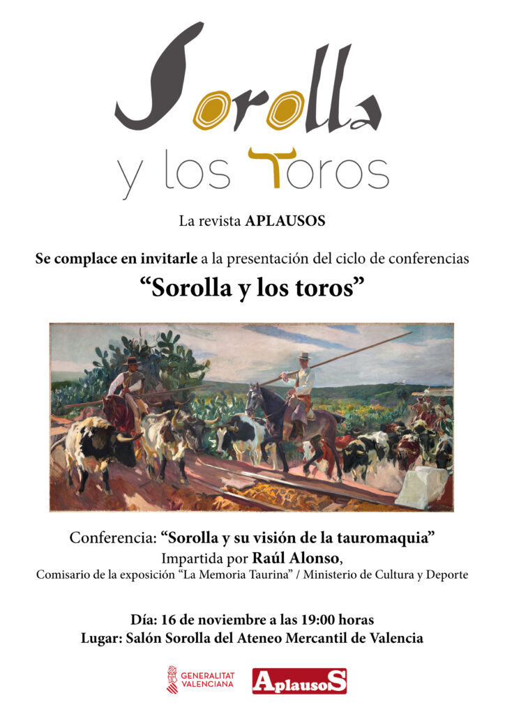 Joaquín Sorolla, valenciano universal, maestro de la luz y el color, será el protagonista de la próxima conferencia en el Ateneo Mercantil de Valencia. Un evento organizado por la Revista Aplausos que servirá para conmemorar el centenario de su muerte. En su vasta y amplia producción pictórica, el genial artista hizo una breve inmersión en el mundo del toro. De este trabajo surgieron dos de sus obras más representativas de temática taurina, El encierro (1914) y Los toreros (1915).