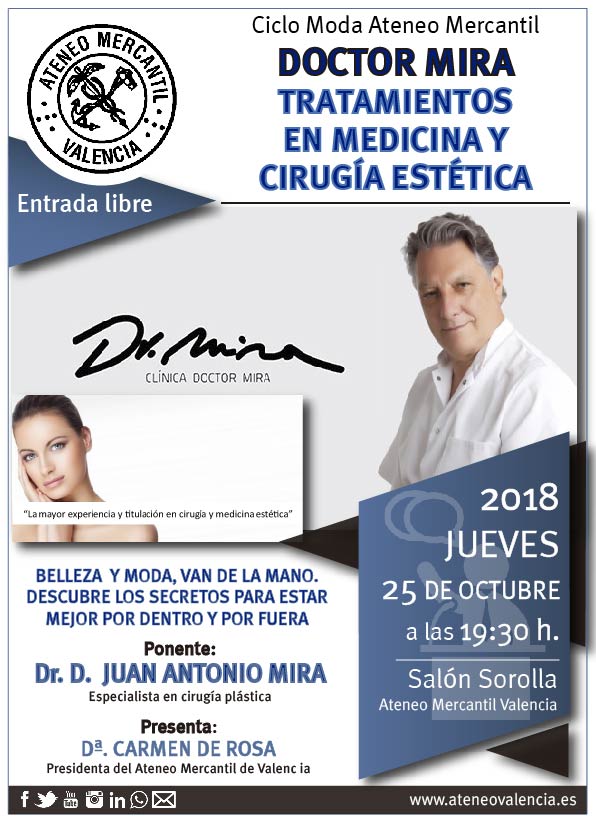 El Ciclo de Moda del Ateneo Mercantil regresa tras las vacaciones de verano con una conferencia en el Salón Sorolla de nuestra institución que traerá los Tratamientos de Belleza y la Cirugía Estética del Dr. D. Juan Antonio Mira. La Clínica Mira tiene un enorme prestigio internacional, ya que está dirigida por este especialista en Cirugía Plástica, Estética y Reparadora en España, que posee más de 100 titulaciones en todo el mundo y que tiene una enorme experiencia en cirugía estética durante más de 35 años.