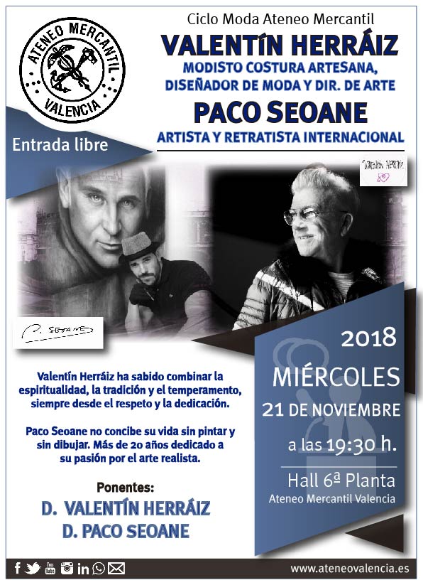 El Ciclo de Moda del Ateneo Mercantil de Valencia ha programado para su segunda cita del curso 2018-19, una conferencia en la que están invitados el modisto de costura artesana, diseñador de moda y director de arte, Valentín Herráiz, y el artista y retratista internacional, D. Paco Seoane. La conferencia será el próximo miércoles 21 de octubre a las 19.30 horas en el hall del sexto piso.