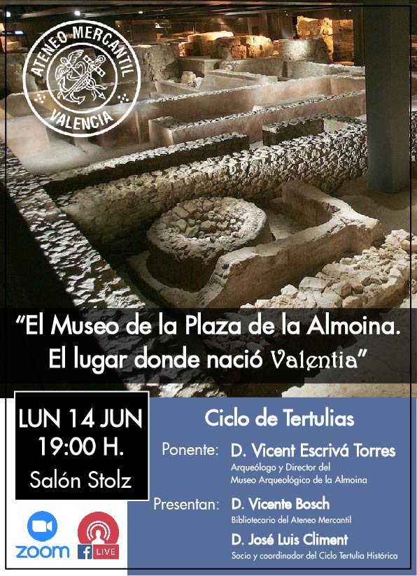 El Ciclo Tertulia Histórica regresa el próximo 14 de junio a las 19 horas en el Salón Stolz del Ateneo Mercantil con la conferencia "El Museo de la Plaza de la Almoina. El lugar donde nació Valentia" y el ponente será el arqueólogo y director del Museo Arqueológico de la Almoina, D. Vicent Escrivá Torres. La conferencia se ofrecerá también online mediante la plataforma Zoom.