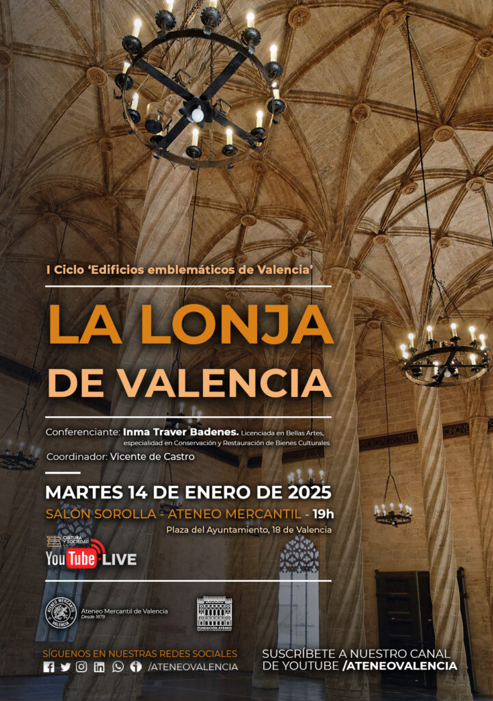 Nueva conferencia del Ciclo Edificios Emblemáticos de Valencia que organiza la Fundación del Ateneo CV en la que se hablará sobre una de las grandes joyas de la ciudad, un edificio que es Patrimonio de la Humanidad de la Unesco. La Lonja de la Seda es uno de los ejemplos más destacados del gótico civil en Europa. Los historiadores del arte distinguen su estilo como gótico mediterráneo o meridional.