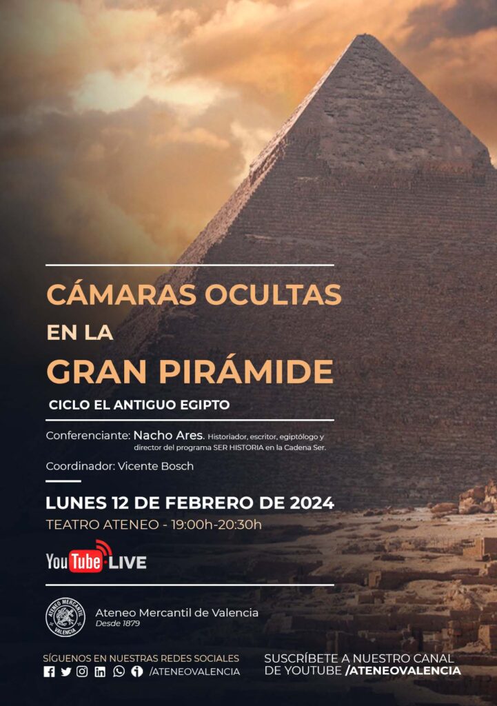 "Cámaras secretas en la Gran Pirámide" es la próxima conferencia de Nacho Ares, quien viene a Valencia para ofrecerla de manera presencial en el Teatro Ateneo. Recientemente se ha dado a conocer la existencia de una nueva cámara en la cara norte de la Gran Pirámide. El monumentos nos ha cautivado desde hace generaciones. En esta charla hablaremos de los últimos hallazgos y cómo se han desarrollado los estudios de radar para buscar nuevas cámaras.