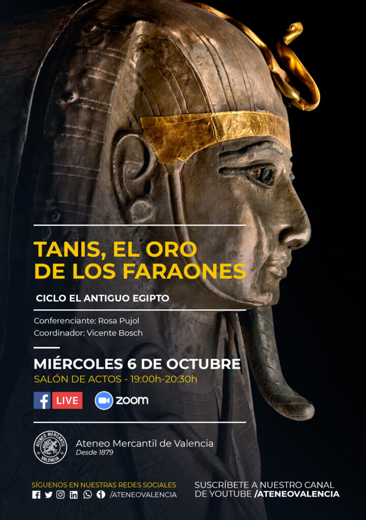 Una nueva conferencia del Ciclo El Antiguo Egipto llega al Ateneo Mercantil el próximo miércoles 6 de octubre a las 19 horas en Salón de Actos. La presidenta de la Asociación Española de Egiptología, Rosa Pujol, nos trae "Tanis, el oro de los faraones", el otro gran tesoro de Egipto.
