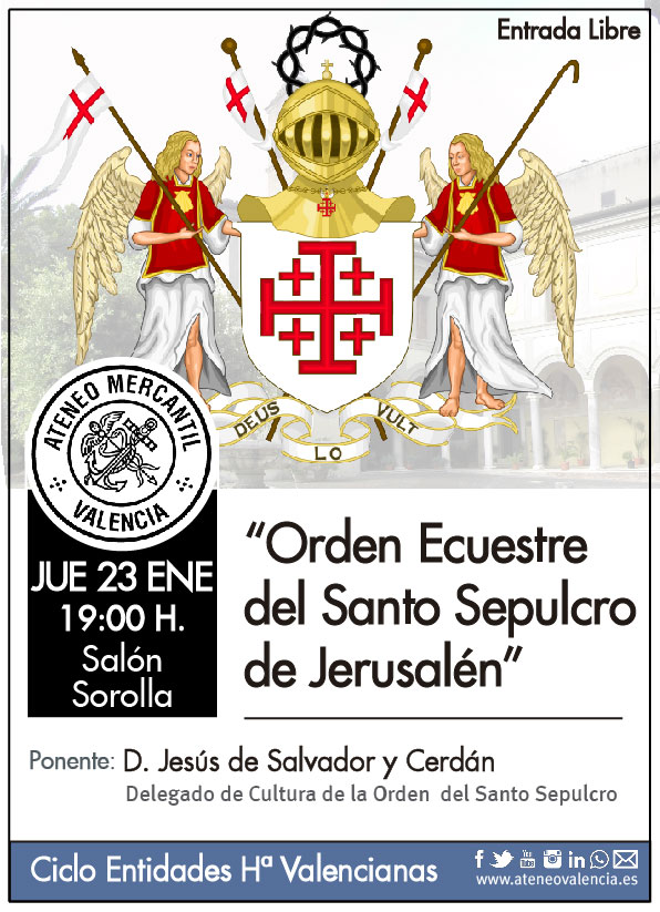 La siguiente orden histórica valenciana que se tratará en el ciclo será la "Orden Ecuestre del Santo Sepulcro de Jerusalén". Una conferencia que será el próximo jueves 23 de enero a las 19 horas en el Salón Sorolla y que será desarrollada por el delegado de Cultura de la Orden, D. Jesús de Salvador y Cerdán.