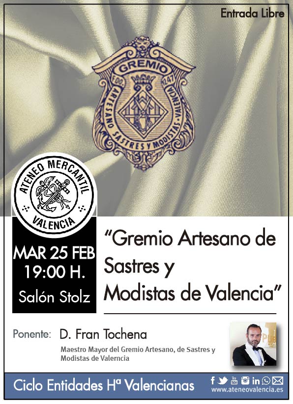 El Gremio Artesano de Sastres y Modistas de la Comunidad Valenciana será la siguiente entidad histórica valenciana en desfilar por el Ateneo Mercantil. Una conferencia que impartirá el Maestro Mayor del Gremio Artesanos, de Sastres y Modistas de Valerncia, D. Fran Tochena, el próximo martes 25 de febrero a las 19 horas en el Salón Stolz.