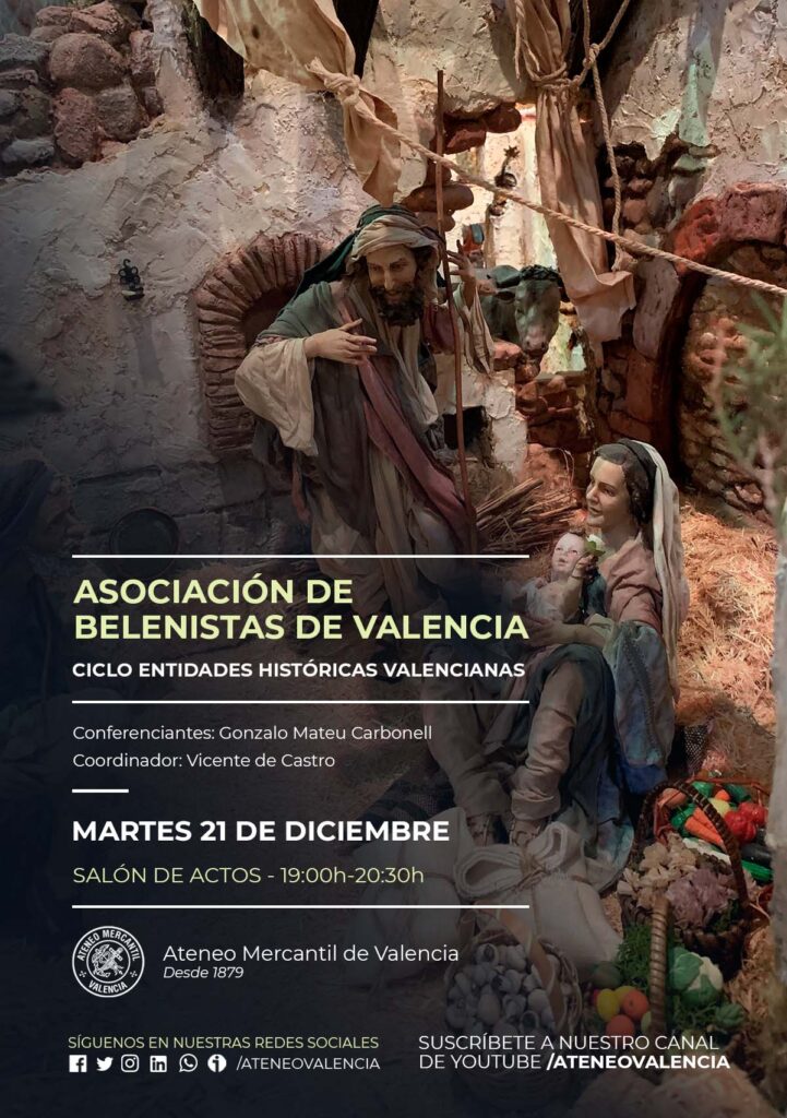 El Ciclo Entidades Históricas Valencianas regresa al Ateneo Mercantil con una nueva conferencia el próximo martes 21 de diciembre a las 19 horas en el Salón de Actos. En esta ocasión se conocerá de cerca la historia y las actividades que llevan a cabo dentro de la Asociación de Belenistas de Valencia, gracias a la ponencia del presidente de los belenistas valencianos, Gonzalo Mateu Carbonell.