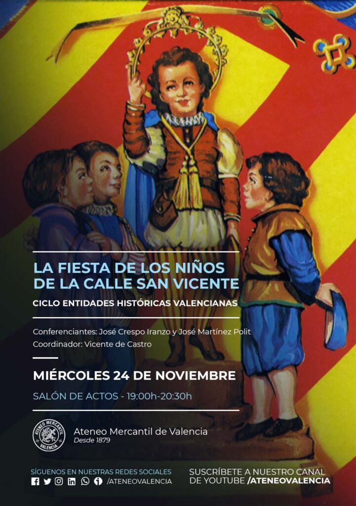 El Ciclo Entidades Históricas Valencianas realiza una nueva conferencia en el Ateneo Mercantil el próximo miércoles 24 de noviembre a las 19 horas en el Salón de Actos que llega bajo el título "La Fiesta de los Niños de la calle San Vicente" y cuyos ponentes serán D. José Crespo Iranzo, vocal de la Asociación Fiesta de los Niños de la calle San Vicente y Delegado en Junta Central Vicentina, y D. José Martínez Polit, vicepresidente 2º y al frente de las áreas de protocolo y relaciones externas de la Asociación Fiesta de los Niños de la calle San Vicente.