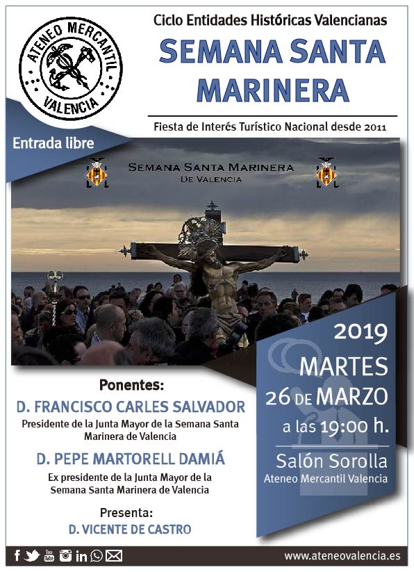 En la próxima reunión del Ciclo de Entidades Históricas Valencianas llega hasta el Ateneo Mercantil de Valencia, la Semana Santa Marinera. La conferencia será el próximo martes 26 de marzo a las 19 horas en el Salón Sorolla. Una conferencia en la que actuarán de ponentes D. Francisco Carles Salvador, presidente de la Junta Mayor de la Semana Santa Marinera de Valencia y D. Pepe Martorell Damiá, ex presidente de la Junta Mayor de la Semana Santa Marinera de Valencia.