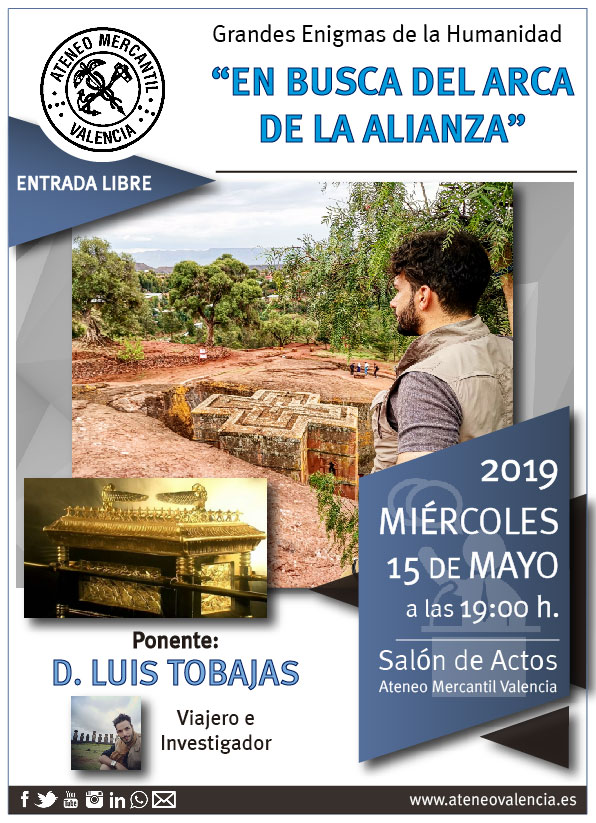 Los seguidores de D. Luís Tobajas y del Ciclo Grandes Enigmas de la Humanidad están de enhorabuena porque llega una nueva conferencia del viajero e investigador en el Ateneo Mercantil de Valencia. Una conferencia que será el próximo 15 de mayo a las 19 horas en el Salón de Actos y llega bajo el título: "En busca del Arca de la Alianza". El Arca de la Alianza, según la Biblia, es la caja que guardaba las Tablas de la Ley de Moisés con los Diez Mandamientos, y constituye el objeto sagrado más codiciado y más buscado por el hombre. Uno de los mayores misterios para los creyentes de las religiones judeocristianas es la localización actual del Arca de la Alianza. Existen muchas teorías en relación con su posible paradero, aunque nadie lo conoce con certeza.