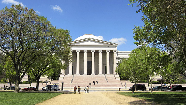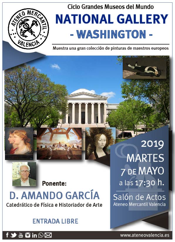 El próximo Museo del Mundo que se expondrá en el Ateneo Mercantil de Valencia será la Galería Nacional de Arte (la National Gallery of Art de Washington D. C. Un museo que se fundó en 1937 y se compone de dos edificios unidos por un pasaje subterráneo. El edificio original, que actualmente se conoce como edificio oeste, se abrió en 1941. Su diseño es neoclásico, con un pórtico con columnas y una cúpula que recuerdan el Panteón de Agripa. También tiene unas alas simétricas a ambos lados de la cúpula. El proyecto es de John Rusell Pope, cuya otra gran obra en Washington también incluye una cúpula, el Monumento a Jefferson.