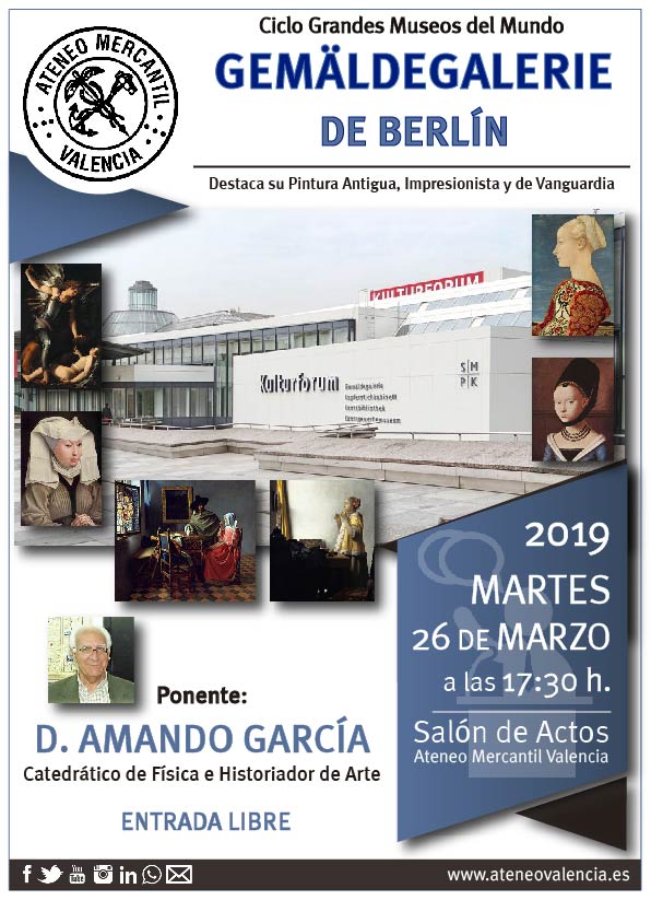 La Gemäldegalerie es el siguiente museo que se desgranará dentro del Ciclo Grandes Museos del Mundo. La conferencia llegará el próximo martes 26 de marzo a las 17.30 horas en el Salón de Actos del Ateneo Mercantil. El ponente será D. Amando García que es especialista en Historia del Arte y el encargado de hacer este ciclo que es seguido por cientos de socios en nuestra casa. La Gemäldegalerie es una pinacoteca que forma parte del conjunto de Museos Estatales de Berlín. Cuenta con una destacada colección de arte europeo desde el siglo XIII hasta el XVIII. Se ubica en el Kulturforum al oeste de la Potsdamer Platz. Su colección incluye obras maestras de artistas tales como Durero, Lucas Cranach el Viejo, Hans Holbein, Van der Weyden, Van Eyck, Sanzio, Tiziano, Caravaggio, Rubens y Rembrandt. Se inauguró en 1830.