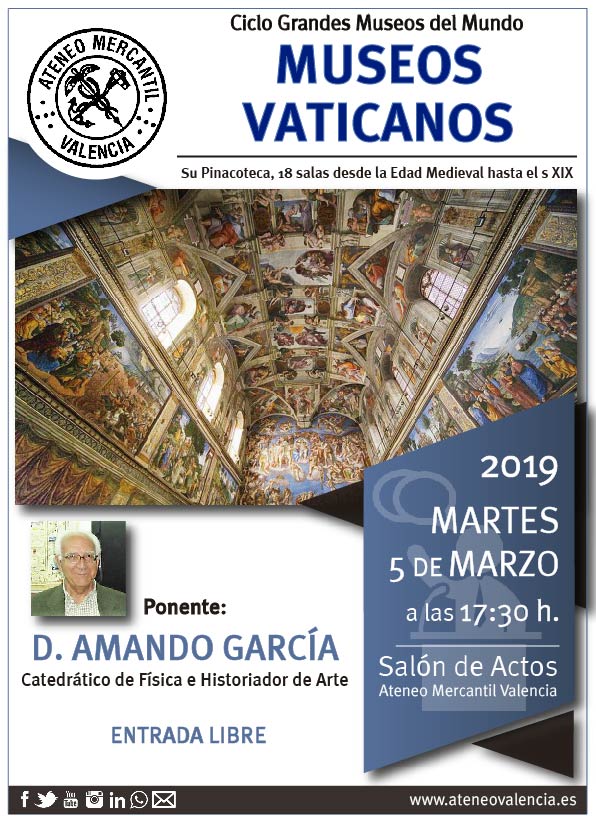 El siguiente museo que se analizará en el Ciclo de Grandes Museos del Mundo será los Museos Vaticanos. Conferencia que impate D. Amando García en el Salón de Actos a las 17.30 horas el próximo 5 de marzo. Los Museos Vaticanos son las galerías y el conjunto de estancias de valor artístico que está en la Ciudad del Vaticano. Este museo muestran obras de una extensa colección de la Iglesia católica. Su base fundacional fue la colección privada de Julio II, que fue elegido papa en el año 1503; más tarde otros papas han ido aumentando las extensas colecciones de que constan estos museos. Este conjunto museístico se compone de diferentes edificios de museos temáticos, edificios pontificios, galerías, monumentos y jardines. A este conjunto de edificios también pertenece la Biblioteca Vaticana, una de las mejores del mundo.