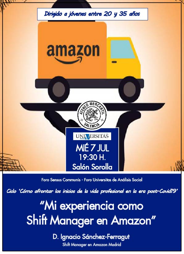 El próximo miércoles 7 de julio a las 19.30 horas llega al Salón Sorolla una nueva reunión del Ciclo ‘Cómo afrontar los inicios de la vida profesional en la era post-Covid19’ que organizan el Foro Sensus Communis del Ateneo Mercantil y el Foro Universitas de Análisis Social. Una reunión dirigida a jóvenes entre los 20 y los 35 años que llega bajo el título "Mi experiencia como Shift Manager en Amazon" y estará dirigida por la Shift Manager en Amazon Madrid, D. Ignacio Sánchez-Ferragut.