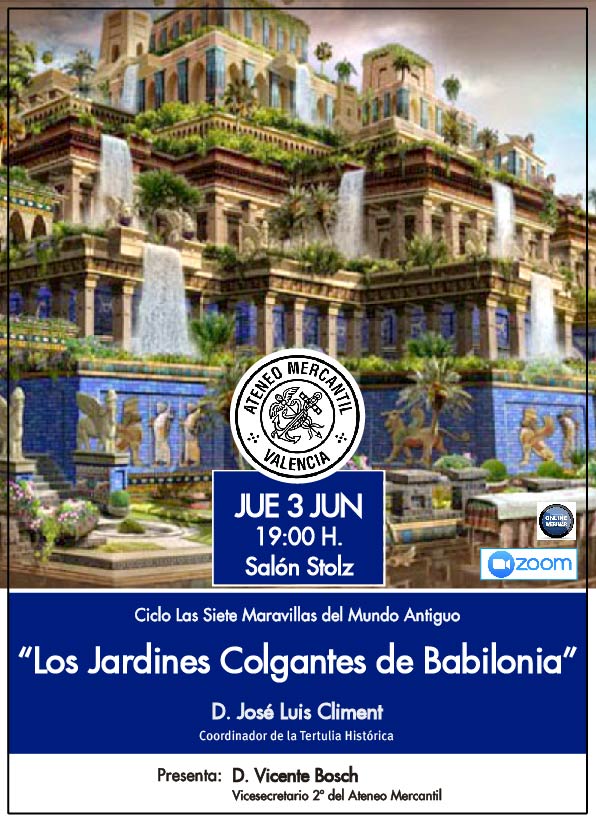 La cuarta conferencia del Ciclo Las Siete Maravillas del Mundo Antiguo que se está celebrando en el Ateneo Mercantil será para "Los Jardines Colgantes de Babilonia". La conferencia será el próximo jueves 3 de junio a las 19 horas en el Salón Stolz y el ponente será D. José Luis Climent, el coordinador de la Tertulia Histórica del Ateneo.