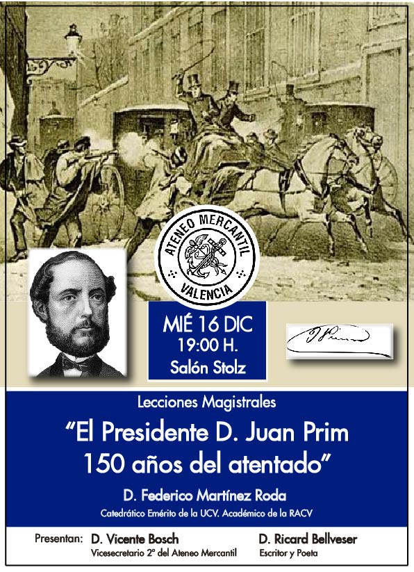El próximo miércoles 16 de diciembre a las 19 horas en el Salón Stolz regresa el Ciclo Lecciones Magistrales de la mano del catedrático emérito de la UCV y académico de la RACV, D. Federico Martínez Roda, quien traerá una conferencia sobre el atentado que sufrió el presidente D. Juan Prim y que este mes de diciembre se cumplen 150 años.