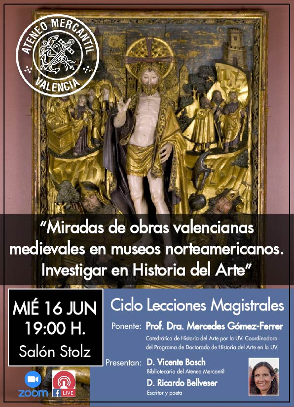 El Ciclo Lecciones Magistrales llega al Ateneo Mercantil de Valencia con una nueva reunión en la que pasan por nuestra casa los mejores especialistas en distintas materias del arte, la cultura, la política y la economía de la Comunitat Valenciana. Así el próximo miércoles 16 de junio a las 19 horas se desarrollará en el Salón Stolz del Ateneo Mercantil, la conferencia "Miradas de obras valencianas medievales en museos norteamericanos. Investigar en Historia del Arte" y la ponente será la Prof. Dra. Mercedes Gómez-Ferrer que es Catedrática de Historia del Arte por la Universitat de València y Coordinadora del Programa de Doctorado de Historia del Arte en la UV.