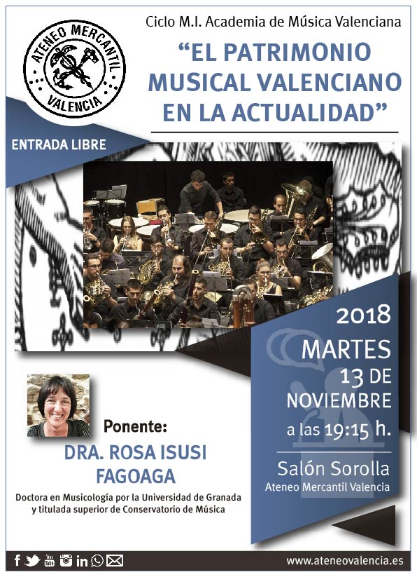 El próximo martes 13 de noviembre a las 19.15 horas llega una nueva cita con el Cilo M.I. Academia de la Música Valenciana en el Salón Sorolla. Una conferencia que llega bajo el título: "El patrimonio musical valenciano en la actualidad: de la investigación a la difusión social y pedagogía" que contará como ponente a Dª Rosa Isusi Fagoaga, que es doctora en Musicología por la Universidad de Granada y titulada superior de Conservatorio de Música, además de profesora de Didáctica de la música en la Facultat de Magisteri de la UV e investigadora y directora de la revista CEIR del Instituto Universitario de Creatividad e Innovaciones Educativas de la Universidad de Valencia.