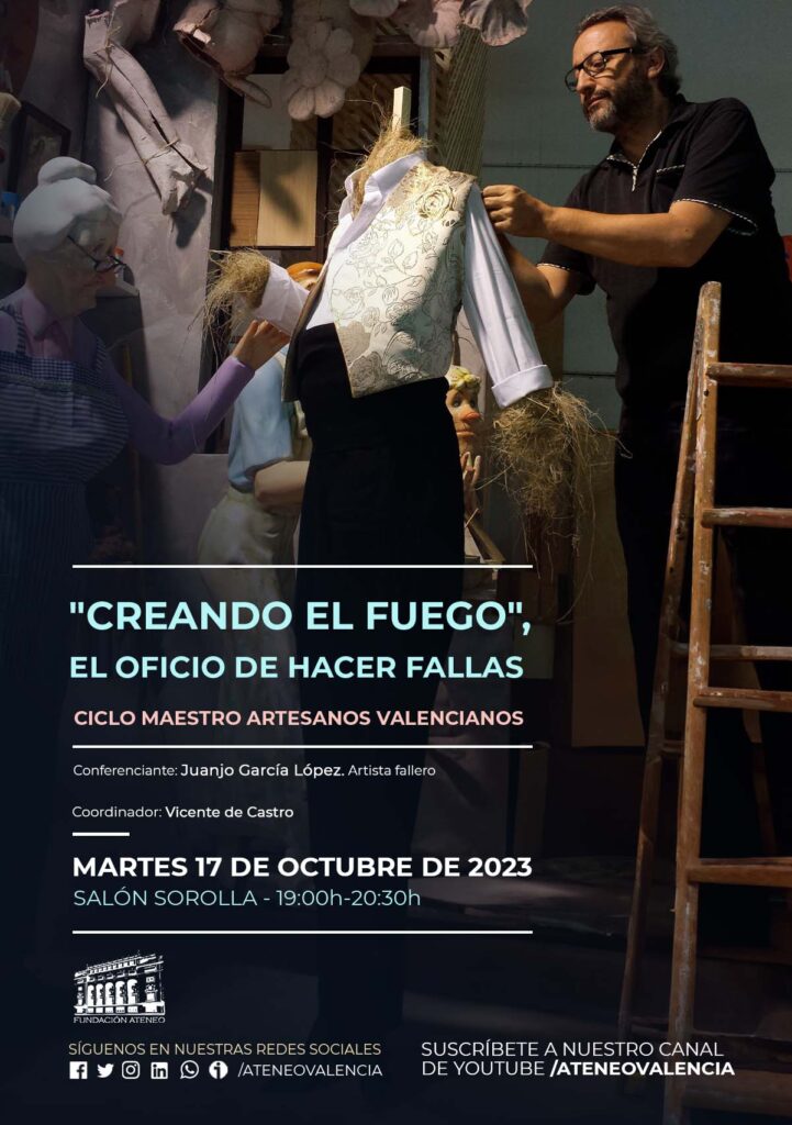 En esta primera conferencia se hablará con un maestro fallero para tratar de explicar el oficio de hacer fallas. La conferencia se titula Creando el fuego. El oficio de hacer Fallas y el ponente será Juanjo García López, representante de la segunda generación de artistas falleros iniciada por su padre Juan García, de quien aprendió el oficio.