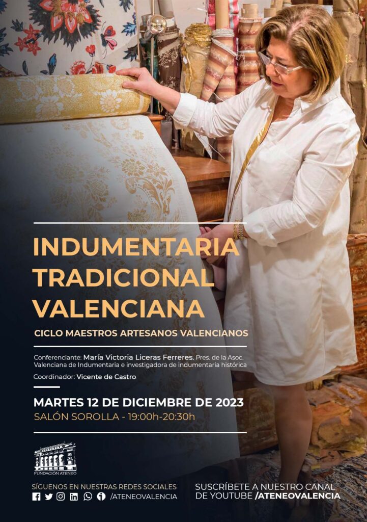 La Fundación del Ateneo Mercantil de Valencia organiza la tercera conferencia del Ciclo Maestros Artesanos en la que se tratará la indumentaria valenciana. Bajo el título "Evolución en la indumentaria tradicional valenciana", la presidenta de la Asociación Valenciana de Indumentaria e investigadora de indumentaria histórica, María Victoria Liceras Ferreres, nos hablará sobre los trajes populares valencianos.