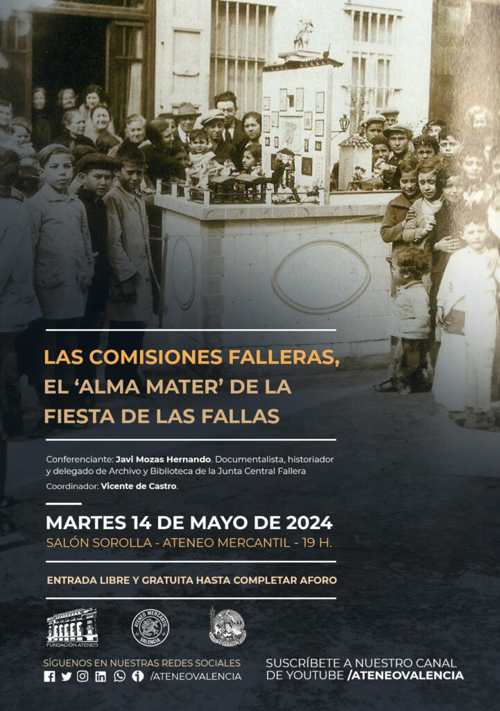 La Fundación del Ateneo Mercantil de la CV organiza una nueva conferencia que se enmarca en el Ciclo Maestros Artesanos Valencianos y que llega bajo el título "Las Comisiones Falleras, el ‘alma mater’ de la fiesta de Las Fallas" cuyo ponente será documentalista, historiador y delegado de Archivo y Biblioteca de la Junta Central Fallera, Javi Mozas Hernando. Una conferencia que trae el origen y la historia de las comisiones falleras.